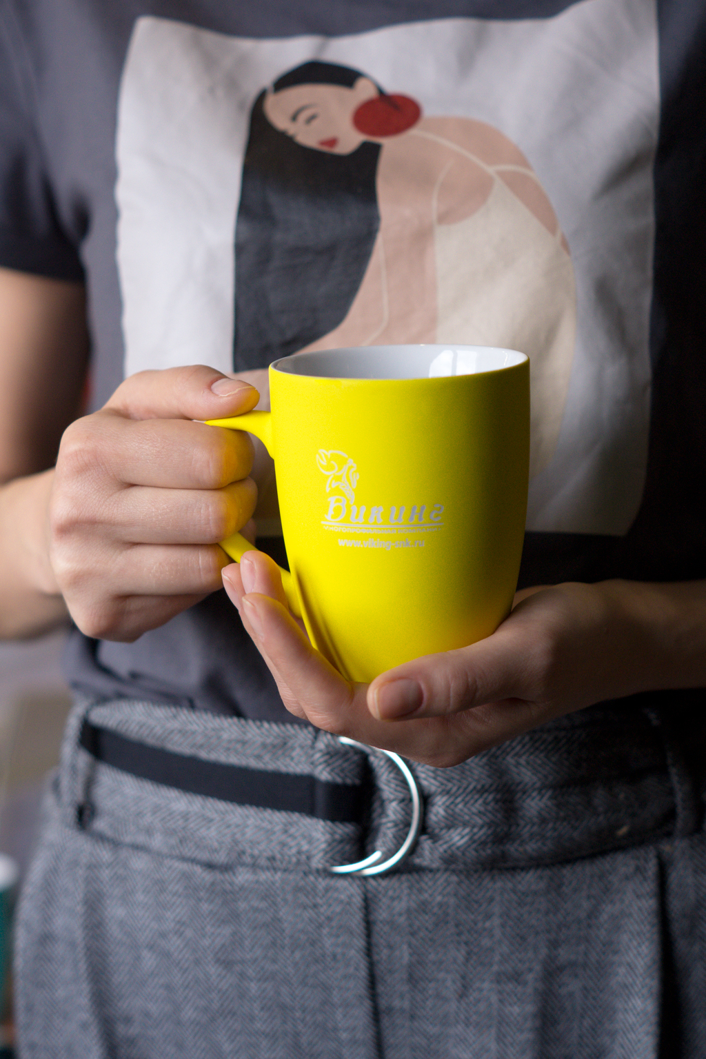 При изготовлении керамической кружки с логотипом на заказ, как правило, применяется деколирование с предварительным нанесением готового рисунка на трафарет методом шелкографии. Полученная картинка переносится на брендируемое изделие сухим способом или методом сдвижения с использованием воды. После первоначальной сушки посуду обжигают в муфельной печи при температурах до 800°C.